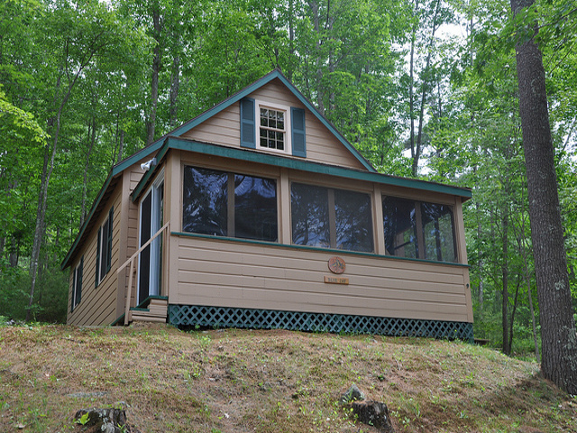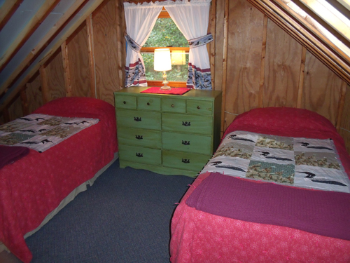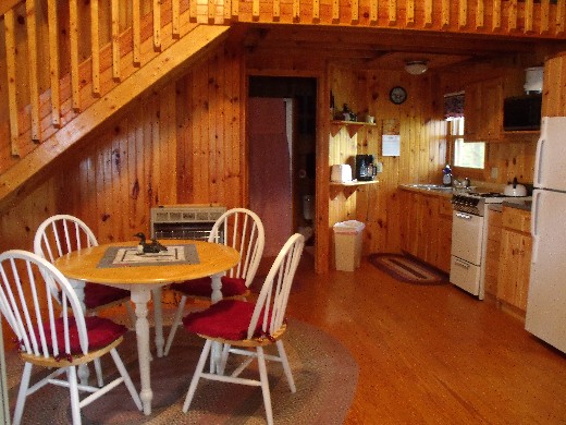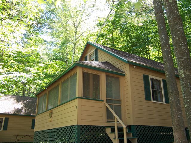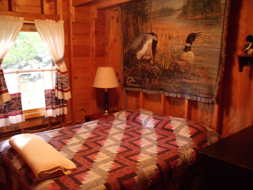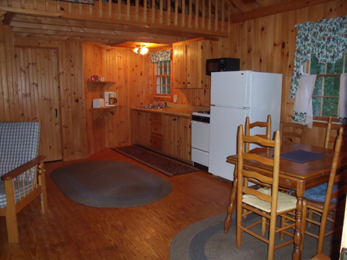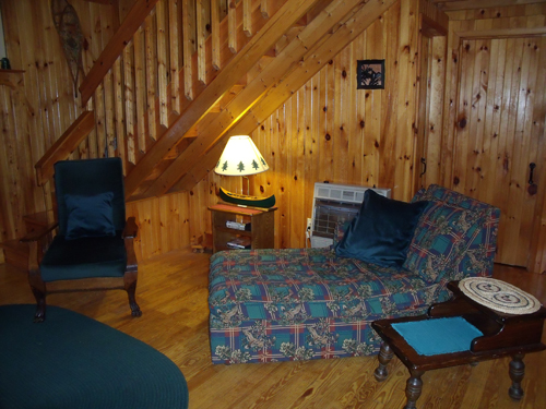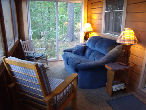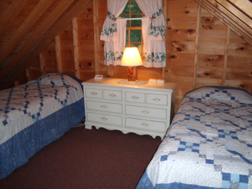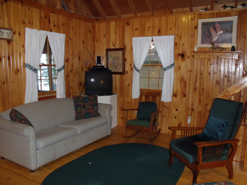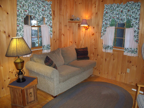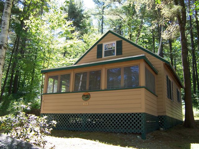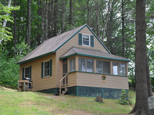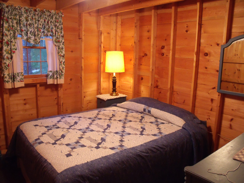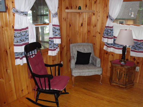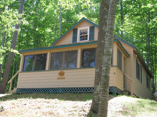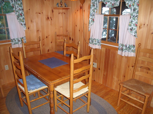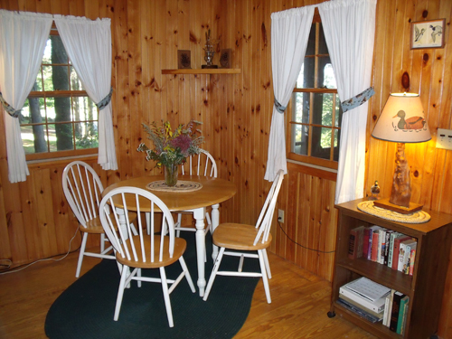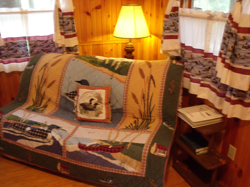 The first cottage built, actually built by Richard himself, was the template for each and every one of the cottages that followed. Throughout Loon cottage is the evidence of Barbara's attention to detail; from the loon decor, to the handmade quilts on the beds. The Loon cottage's location offers both privacy and a close proximity to the recreation field. The cottage features a front porch that allows guests to enjoy a view to exceptional sunsets, Androscoggin Lake and Angell Cove's private beach. The cozy interior, highlighting the loon motif, features solid pine paneling, comfortable furniture and accessories with a predominantly burgundy and blue color scheme.