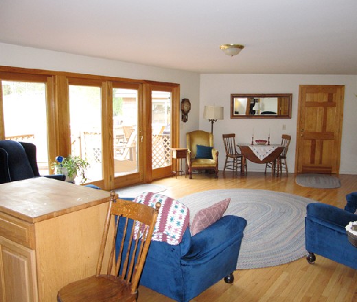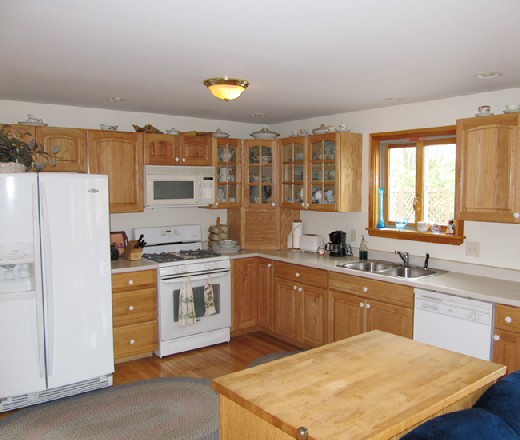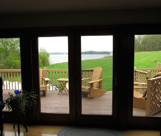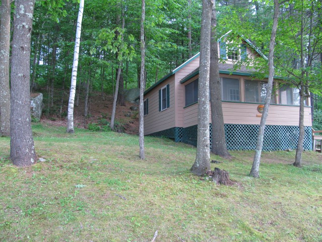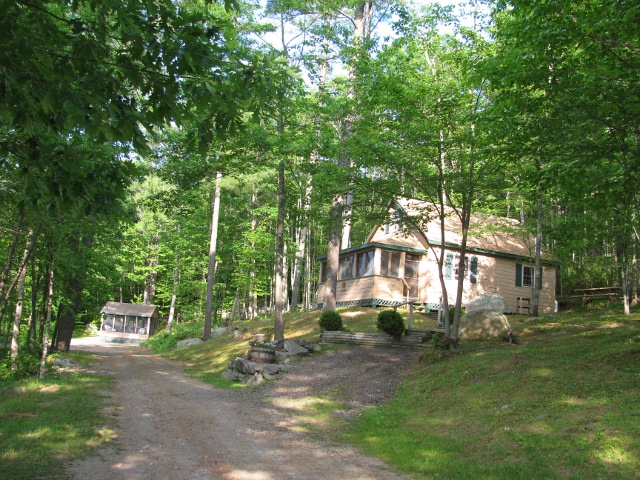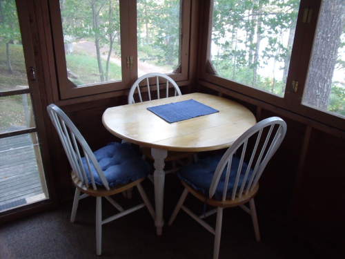 Adjacent to our cul-de-sac and our spacious screen house, and featuring a log paved walkway (reminiscent of the Appalachian Trail), the Blue Jay Cottage features a front setting porch with and additional sliding glass door. It's location lends itself to seclusion and quiet enjoyment of the pristine view of Androscoggin Lake. Once inside the Blue Jay, guests feel right at home with the calming blue and beige decor, open and spacious kitchen and dining area, as well as comfortable furnishings.