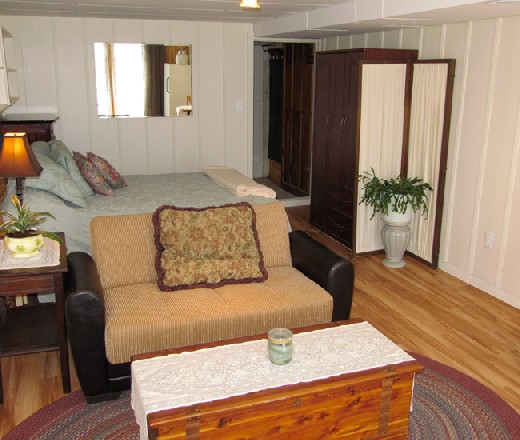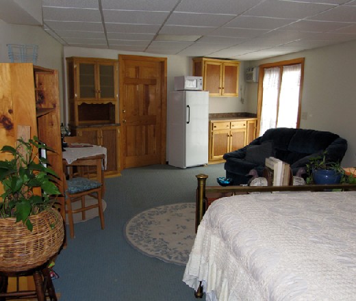 The Mallard is one of Angell Cove's original cottages. The Mallard's location in the complex and front porch feature, lets guests take in a wide view of Androscoggin lake, the private beach and children's playground. A black sand island that is home to a pair of Bald Eagles, sunsets to the west, and a variety of water birds are just a few of mother nature's gift's that you will enjoy. The Mallard cottage's interior decor embraces guests with it's green colors, open sitting area (featuring a large, comfy chaise lounge) and a woodsy feel.
